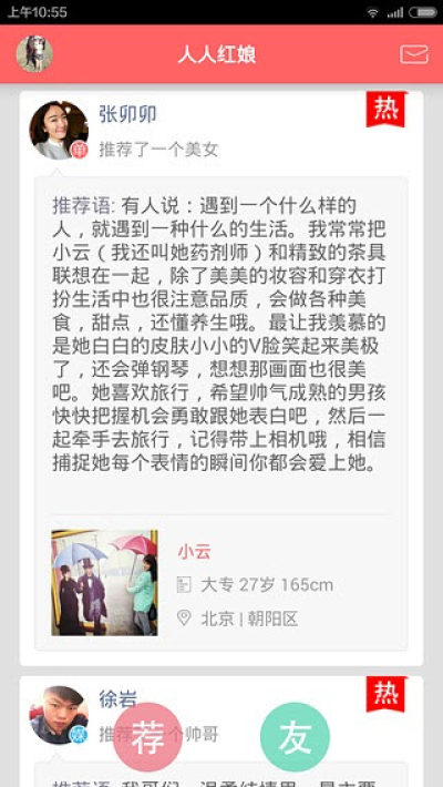 人人红娘是一款朋友圈婚恋交友神器,在这里每个人都可以当红娘为其它好友进行牵线搭桥,成就美好姻缘,同时身为单身的你可以也会通过别人的帮助找到人生中的另一半哟,感兴趣的朋友快加入进来吧!
