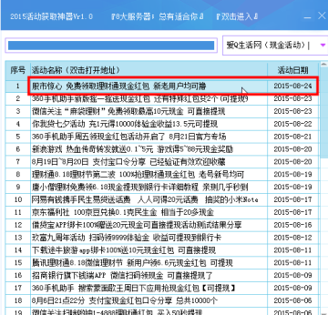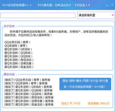 软件属于互联网活动收集系列,收集8大服务器。方便用户,游客及时看到最新的活动资源。并且对自己/他人提供帮助!