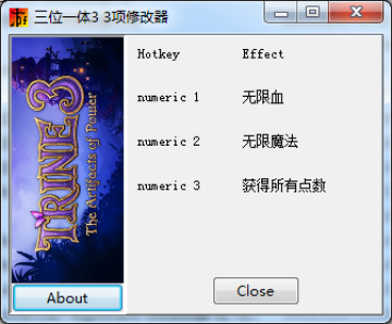 三位一体3全版本修改器,由游侠会员Fy丶 原创制作,该修改器的最大特色就是可支持游戏全部版本,以后就算游戏版本更新玩家也能够正常使用。该修改器包含了三项功能,有需求的玩家快来下载使用吧!