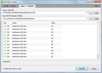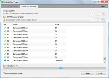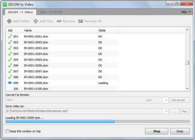 DICOM to Video的功能非常的简单实用,就是在DICOM和视频格式文件之间进行相互的转换,让用户得到他们需要的格式文件。用户使用这个工具DICOM视频实际上是一个简单的工作,有相当多的输出格式可供选择。 除了它可以创建MP4,AVI,MPEG,DVD,VCD,对WMV,FLV,MOV和3 gpp剪辑,该实用程序为每个人提供了一个高级设置菜单,这样你就可以配置视频分辨率和帧速率之前进行转换。