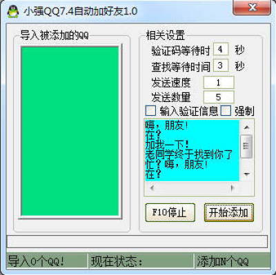 小强QQ自动加好友绿色版是一款简单易于使用能够帮助各位朋友进行批量加QQ好友的软件。使用这款软件添加好友可以实现直接绕过QQ验证,直接加对方为好友。新版在原有的基础添加了强制功能,让您想加就加,实在是营销推广的神器。