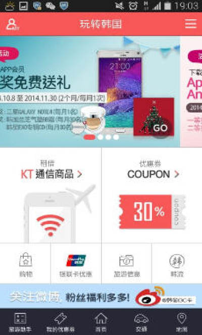 玩转韩国安卓版下载(韩国旅游资讯)是一款运行在安卓平台下的免费提供的韩国旅游资讯与服务手机软件,提供韩国旅游景点资讯,让您做好韩国旅游功略,还有各种优惠券,快来下载吧...