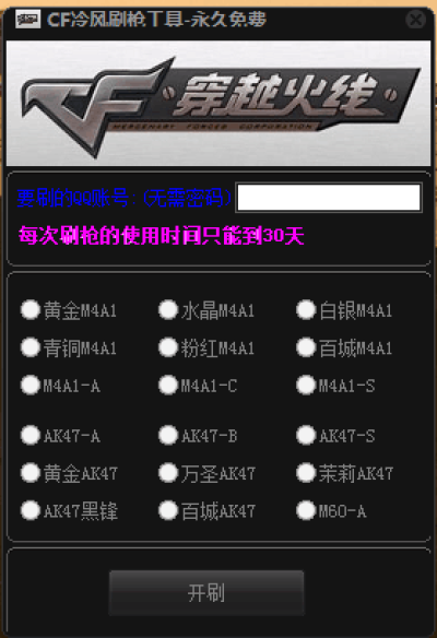 CF冷风刷枪辅助工具是一款非常好用的穿越火线免费刷枪辅助,你可以使用这个软件刷心仪的CF枪支,软件打开后,选择要刷的枪,开刷后能刷到枪并可以使用22天左右,过期后可以再次用本软件刷,可刷的枪有黄金AK47,白色,青铜等枪。软件完全免费,刷枪效率当前最高。