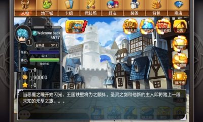 3、界面上方显示为菜单,点击商店招募卡牌,点击地下城进入战斗场景,选择关卡进入;