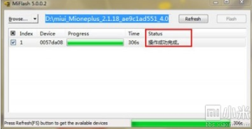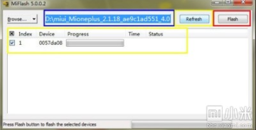 点击黄色圈选部分Refresh,刷机程序会自动识别手机,点击红色圈选部分Flash开始刷机。
