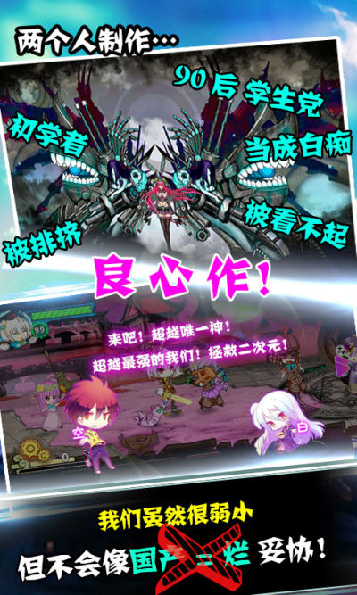 征战二次元是一款二次元横版策略塔防手游,由天朝ACG学生党冥夜、当歌研发,二次元萌物祖龙儿脑洞策划。游戏以二次元新世界为背景,由秦萌皇龙儿亲自领队,携领众多动漫、游戏宅大战各路萌贱魔物!其中充斥着各种动漫元素和萌细胞组织,动漫人物神助攻,二次元道具应有尽有~