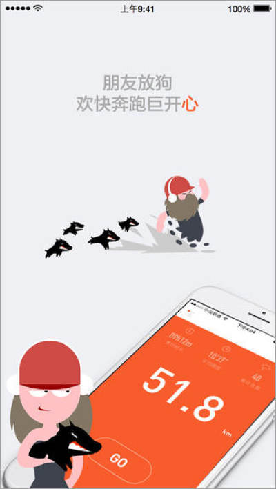 接下来小编要向各位推荐一款炙手可热的运动类应用——阿甘跑步,跑友可以用它记录跑步的公里数,累计跑步时长,累计次数,然后计算平均速度等等,可谓是跑友的人生公里计量器.打开应用跑着的戴耳机大叔和小狗印入眼帘,独特的扁平化设计风格和配色体系令人倍感亲近和舒服,黄橙橙的主色调给人感觉像喝了葡萄汁一般充满活力.