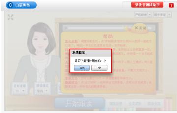 1、下载课件:安装软件后,选择课程列表的课后,会弹出提示“是否下载课件到电脑中”,点击“yes”进行下载。开始下载文件,左上角并有进度提示。下载成功后,开始跟读时就会从电脑中读取课件进行跟读,解决网络不稳定问题。