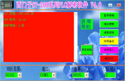 本款西门子s7-200解密软件基本可以确定PPI协议所能破解的西门子S7-200PLC的范围:02.00版以下的,包括部分02.00版本(确切的说是最高只有3级加密功能的plc),通过本软件就可以轻松破解,02.00版以上的,包括02.00版(精确定位是-具备4级加密功能的2.0版本)和所有的200CN型号,只有拆机解密,迄今为止还没有更好的办法!关于版本号,你通过本软件就可以探测到。