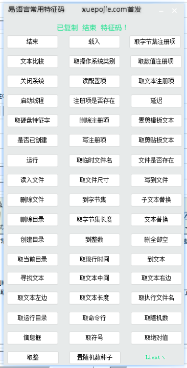 易语言常用特征码是一款用来快速查询易语言常用特征码的感觉,该软件汇集了多个常用的易语言特征码,例如:结束、载入、取字节集注册项、文本比较、关闭系统、取数值注册项、启动线程、延迟等易语言特征码。有了这款工具,一定会让您编程更加轻松愉快的。