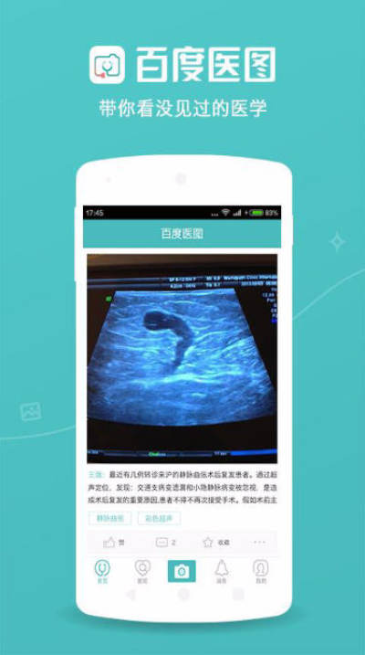 你可以快速浏览医学趣图,可以慢慢品味新奇病例,可以默默坐看他人讨论,可以激昂文字点评热图,你还可以轻轻一点,把你珍藏的医学美图和体悟分享出来。 百度医图,只为你的行医路不再平淡,不再孤单。