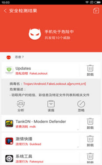 检测手机应用程序是否有“恶意”和“风险”威胁,快速有效完成移动设备的反病毒防护。“恶意”包括木马程序、间谍软件、流氓软件;“风险”包括黑客工具,广告骚扰等。