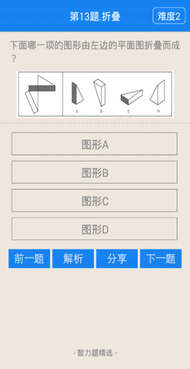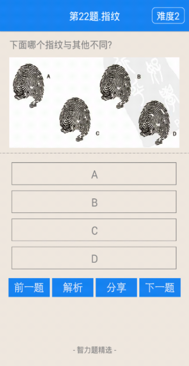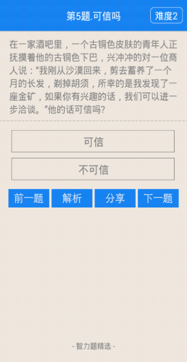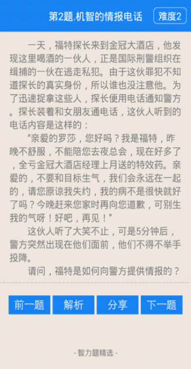 游戏内有各种类型智力题,侦探断案、逻辑推理、趣味数学、空间思维、推箱子等等, 所有题目都是精心挑选的, 有趣也有难度,快来挑战吧! 万一题目太难了,别担心,每道题都有详细的解析,也可以分享到微信、微博、QQ, 考考你的朋友!