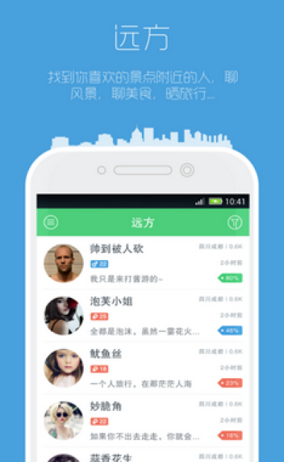 1.远方:社交新模式,独创远方人社交,您可以在应用内分别查看去过,正在和想去远方目的地的酱游儿,这里可以找到你喜欢的景点附近的人,你们可以聊风景,聊美食,晒旅行。