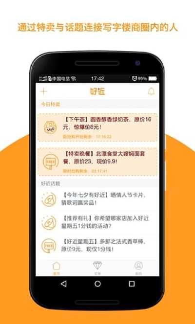 好近是基于写字楼商圈的社区,为上班族和商户搭建一个社交平台,按着上班族的节奏推送附近500米内的特卖,涵盖错峰午饭、下午茶、晚饭、加班夜宵等等,同时好近也为企业开通专享卡服务,即企业员工可以凭借专享卡到与好近合作的商户中消费享受一定的折扣优惠活动;上班族们不用花很多钱和时间也可以享受品质好物、认识兴趣爱好相近的人。