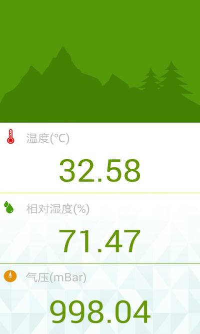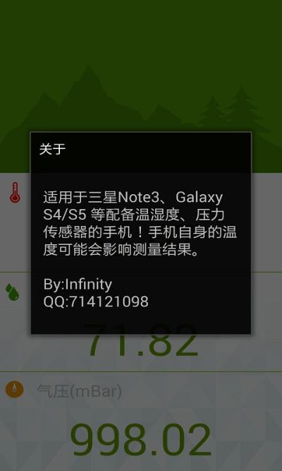 一款简单易用的温度计软件,支持三星Note3、Galaxy S4/S5等支持温湿度传感器的设备,可测量环境温度、湿度、以及大气压强。无广告、无后台。