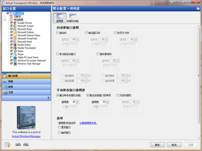 Actual Transparent Window 简体中文破解版简单来说就是可以帮助你将Windwos下的程序窗口改为透明显示,增加透明效果的增强辅助软件,你可以自由的设定启动时、拖动窗口时、改变尺寸时、非当前活动窗口、鼠标悬停时的透明度,也可以设定通过手动点击标题栏按钮、通过选择标题项或者双击标题栏来实现透明效果!支持快捷键操作!