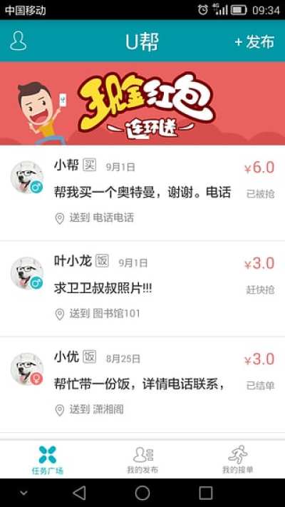 俗话说的好“在家靠父母,出门靠朋友”,那么在校园里面有什么困难的话,就需要依靠同学之间的相互帮助了。U帮,史上最有爱的APP。无论你是需要代取快递、叫外卖、校内代购,还是求安慰、求关心,都可以随时随地发布在U帮,就有大批萌妹子、小鲜肉化身大白,帮你解决问题!