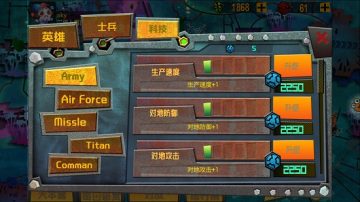 科技类别:分为陆军,空军,导弹,泰坦,通用五类类别;每个类别包含多个科技,比如陆军包含,生成速度,对地防御,对地攻击;每个科技类别的解锁受到军衔的限制。