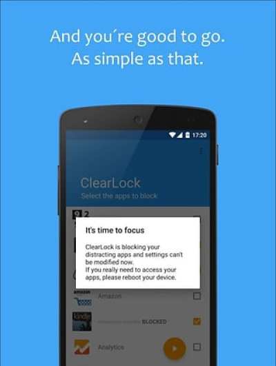 专心锁ClearLock又是一款通过自虐让人专注的应用,锁定后就不能使用指定的“分心应用”,非要用的话得重启系统