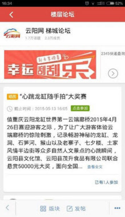 云阳APP客户端,是一款提供云阳生活服务的综合性App。以定制化的方式,收录云阳的风土人情、历史文化、风景名胜和土特产品等诸多当地生活、旅游、购物、娱乐等资讯,并提供详细的图文描述。为商家和本地居民提供生产信息发布平台的同时,加深外界对云阳的认识和了解,希望成为又一个,你喜欢云阳的理由!