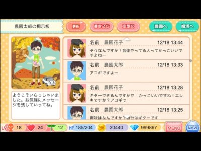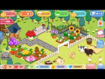 《农园婚活》是由Askiss推出的一款将农场经营融合婚姻模拟游戏。玩家可以在农场里栽种各种蔬果,在收货后则可以变卖为资产,用以扩大自己的农场,或是进购各种装饰物,让它变得更加丰富多姿,最重要的是,还可以用来购买礼物送给心目中那个他,慢慢拉升好感度,最后喜结连理。不过本作也有节操尽失的地方,那就是还加入了离婚元素,让玩家在游戏中与另一半分开后还能去追求下一春!