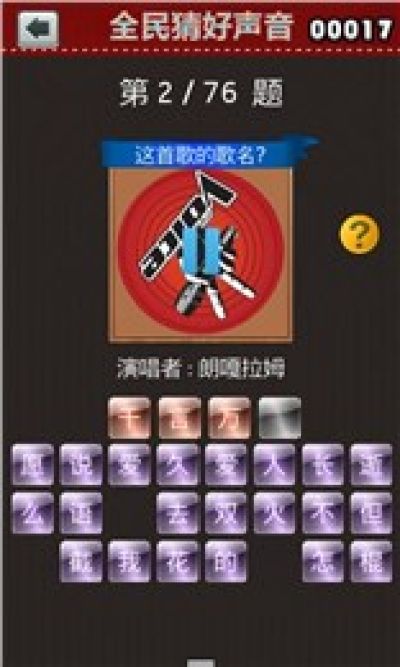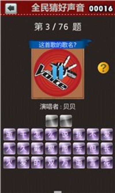 全民猜好声音第4季在游戏中都给出了在比赛中这首歌的演唱者,小编个人认为对于不看好声音的玩家来说基本没有一点提示作用,反而对于好声音关注较多的玩家来说是个大大的提示。对于喜欢音乐的人来说这个也无所谓啦,喜欢就是任性,照样猜歌名。