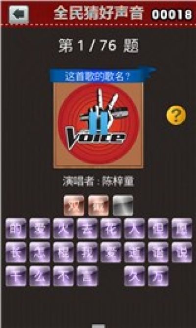 全民猜好声音第4季是一款休闲的小游戏,收录了中国好声音中所有的知名曲目,游戏开始时,给出一小段音乐,然后通过这段音乐来判断是哪首歌,然后在下方的框子中输入歌名。中国好声音的忠实粉丝们在哪里,快来看看你们对好声音的忠实度吧!