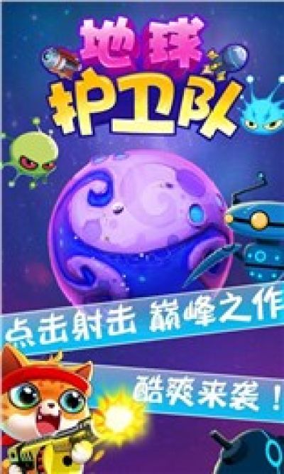 地球护卫队是一款2015最火爆的火力全开的射击类小游戏,喵星人再度来袭,游戏中他会助你一臂之力!本款游戏以外星人入侵地球为背景开发的射击类游戏,点击消灭屏幕中出现的外星人可获得一定数量的金币。