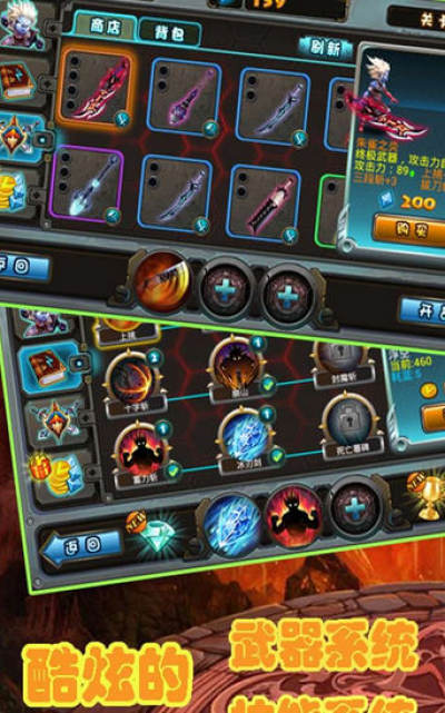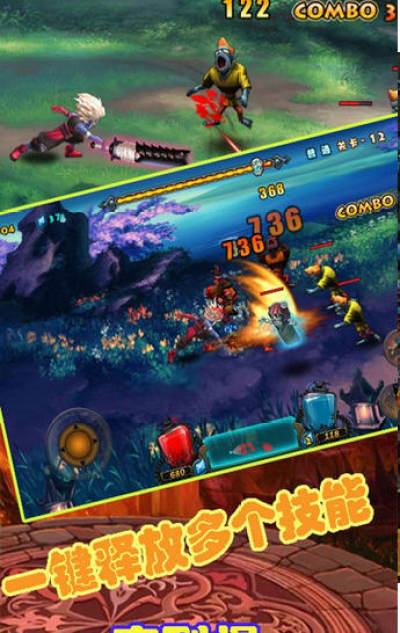 1、全新技能连招系统,一键释放3个技能,任意组合,配合华丽的技能特效,带来无与伦比的超爽打击体验
