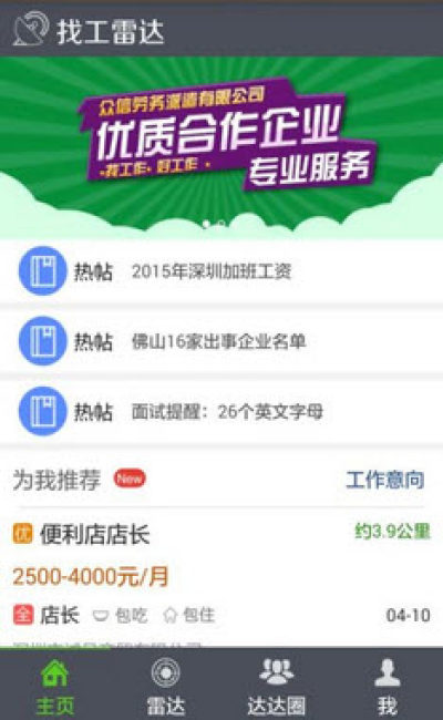 【雷达扫工作】用户可以一键扫描身边的工作,企业用户也可以一键扫描周边的简历,雷达扫描取代了传统编辑文字搜索的查找方式,查找工作更快捷,基于LBS定位技术,根据用户所处位置就近推荐附近工作。
