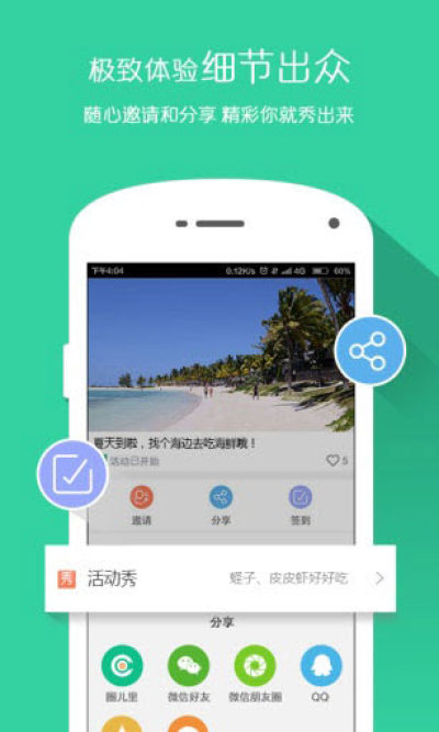 1.【发布活动、一键分享】免费发布各类社交活动,是聚会、聚餐、同学会、校友会、旅游等必备工具,支持一键分享活动至微信、微博、QQ等热门社交平台,快速召集好友参与,想去哪儿玩就去哪玩,一起来互动吧;