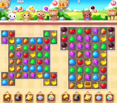 水果狂欢是风格清新可爱的连线消除游戏,快乐热情的小兔子要用美味可口的水果招待朋友,但是摘水果的适合总是遇到很多阻碍和困难。将至少三个相同的水果元素连成一线消除,不同的数量和消除模式会有不同的收获,还有合成道具的机会。