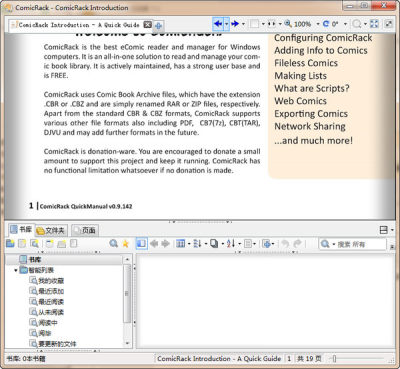 ComicRack是一套专业漫画迷所设计的免费漫画浏览及管理软件。软件支持TAR、RAR、PDF、ZIP等格式,同时功能上可实现内网分享,局部放大,页面亮度、饱和度和对比度设置,拖拽改变顺序等等。ComicRack的最强项是漫画管理,用户通过它可以建立属于自己的漫画资料库,只需要通过几个按键,就能将手边的漫画书分门别类,甚至是依照集数去编排。而所建立的资料库用户还可以进行评分,或添加注解,从而让你可以快速找到喜爱的内容。