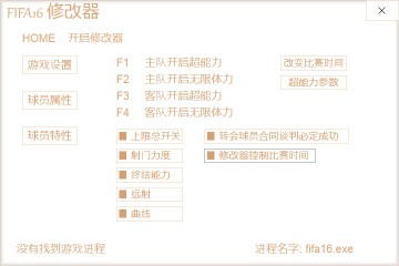 FIFA16多功能修改器,由limnono制作提供,玩家可以通过这个修改器来满足绝大部分的修改需求。该修改器分为游戏设置、球员属性还是球员特性三大部分,想让自己球队变得无比强大的玩家赶快来下载试用吧!
