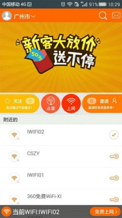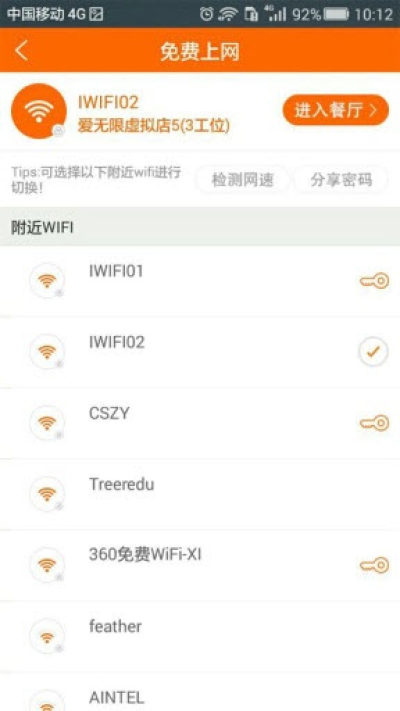 iWiFi是一种可免费上网的无线热点,热点覆盖范围广,涉及校园、车站、机场、商场、企业、娱乐休闲吧和酒店等公共场所,另外该软件还特别加入了“吃货”功能,让你真正做到一边免费、一边享受美食,感兴趣的朋友快来体验一番吧!