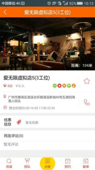 3.提供座位预订、在线点餐、在线外卖下单餐饮服务,提高用户餐饮体验。