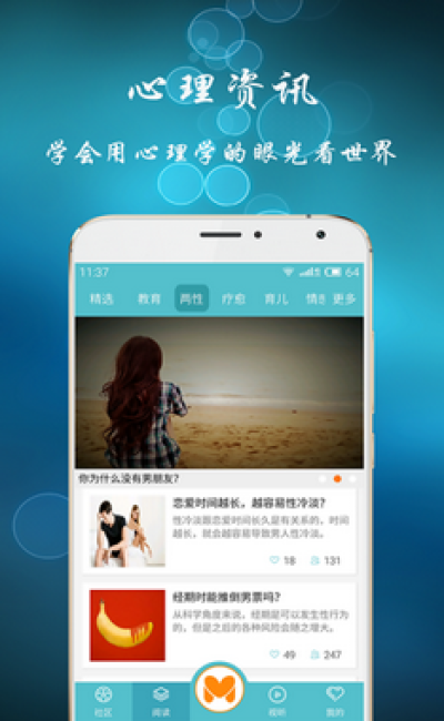 2.心理资讯:海量心理资讯强大的编辑团队整合国内外优质的心理健康文章,包含育儿、两性、情感、职场、教育、疗愈、社会等等各领域心灵鸡汤。