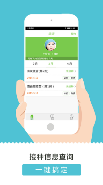 【按时提醒,再也不怕漏打疫苗】与接种点数据对接,全面记录宝宝疫苗接种进度,及时提醒下一次接种时间,妈妈再也不用担心宝宝漏打疫苗了。