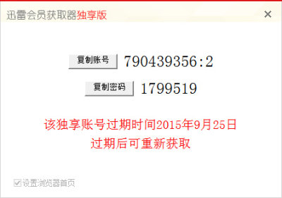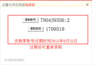 迅雷会员获取器独享版,只要运行一下,即可立即获得会员账号,迅雷会员可使用离线下载,多线程下载,高速通道下载,迅雷看看弹出式播放,去广告等等特权。
