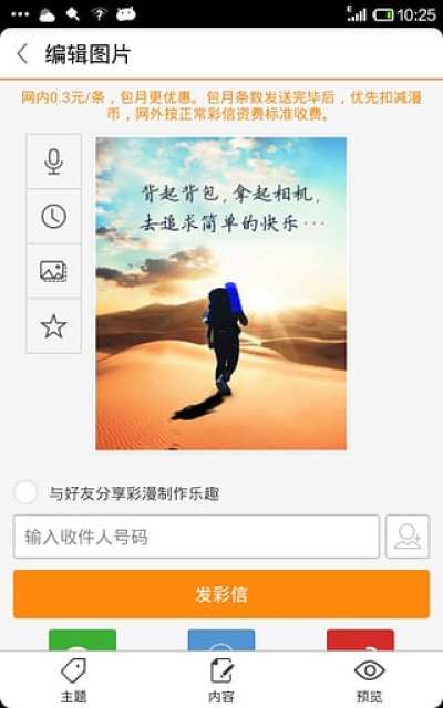 2.精品短语:送朋友、送亲人、祝福、整蛊、调侃等多个场景祝福/表达短语,选择短语智能配图生成彩信,为您省去凑词烦恼;