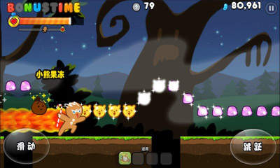 画风可爱的跑酷手游,玩家选择角色后开始跑酷,收集果冻和小熊,游戏结束可以看到自己和其他玩家的成就排行榜。玩家可以更换自己喜欢的角色,挑战好友可以解锁新的角色,花费银币购买新的角色。或者玩家可以升级自己的角色,增强角色属性。