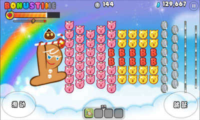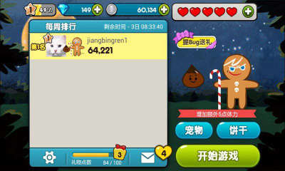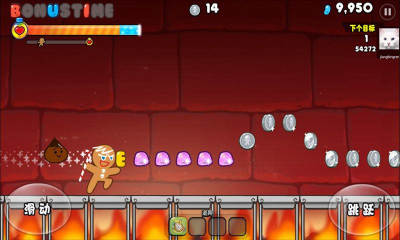 姜饼人酷跑是一款以饼干为主要角色的跑酷游戏,姜饼人为了逃离烤箱的熊熊大火,奋力开跑。选择喜欢的饼干人角色,每个小人的经验值和等级都可以提升,他们拥有不同的属性技能。每次开始游戏玩家拥有五次生命值,在奔跑过程中收集果冻和小熊。
