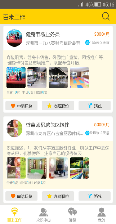 百米工作按距离远近、雇主信用值及搜索的条件来综合排序,为求职者列出最适合的职位,并提供到达工作场所的路线。 为雇主提供全程免费招聘服务。 我们的愿景,让都市蓝领,工作近一点,生活好一点!