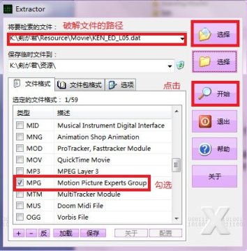 “文件格式”一栏是选择你抽取的封包中文件要转成的最终格式,R社的OP和ED可以转成MPG格式,所以我们这里只勾选这个选项。