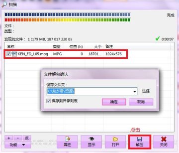 3、等待扫描完成,就会看到一个MPG格式的视频文件。勾选,再点击右下角的“解压”按钮,确认你想存放的路径,等待解压完成,视频就导出来了。