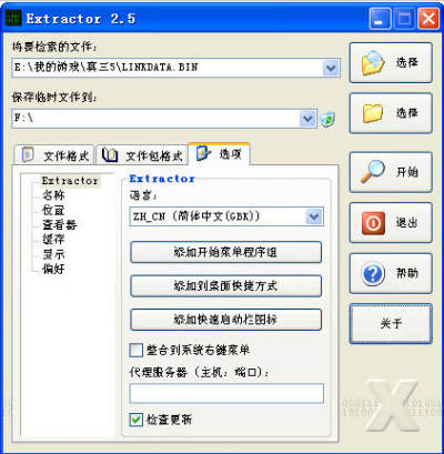 Extractor,一个可以让你从容不迫的应对007,ADAT,APAK,MHW,MIX,MW4,NPAK,PACK,PAK,PBO,PFF,PKR,POD,RES,U,VDF,VPP,WAD,WDIR,WTN,XCR,ZWP等等数十种文件包的解包/封包程序,程序可以在扫描过程中自动按选择的分类识别你需要的文件,有了它,几乎各种游戏的文件包你都可以解开并得到你想要的资源。