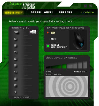 Razer镜面版地狱狂蛇驱动主界面显示着灵敏度调节、飞敏调节,双击速度调节三个选项,其中灵敏节调节还包括一个子菜单,可以在里面分别调整X、Y轴速度和加速度等功能。滚轮页面中可以调节滚轮滚动速度和是否关闭鼠标中键。
