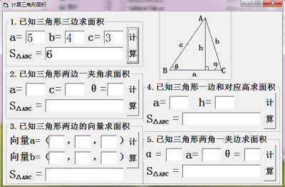 三角形面积计算器是款简单小巧但是实用的计算工具,能够帮助用户快速计算三角形的面积;支持三边长度计算面积、两边长一夹角计算、向量计算等五种计算方法,全面快捷,适合学生和教师或其他需要计算三角形面积的情况。软件内存占用非常小,无需安装,解压双击exe文件即可使用,有需要朋友可以下载体验一下。