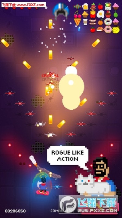 《超能喵星人 Shooting Stars!》是一款像素风休闲游戏,玩家要控制一个踩着飞板的墨镜胡茬大叔展开冒险,大叔的唯一武器就是这只喵咪,这只猫有着凶残的能力,能射出子弹、连锁闪电甚至彩虹镭射光线,帮助大叔对抗入侵各种外星人,拯救世界。还有,游戏会有一个日常挑战模式,让玩家每天都有不同的挑战。